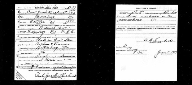 Just over one hundred years ago my great-uncle and namesake, Paul Jacob Kuehnert, went to his polling place in the little Mississippi River town of Wittenberg, Missouri and registered for the draft. In and of itself, that act was unremarkable. Roughly 10 million American men between the ages of 21 and 35 registered that day in compliance with the Selective Service Act passed by the U.S. Congress the month before after it declared war on Germany in April, 1917.
